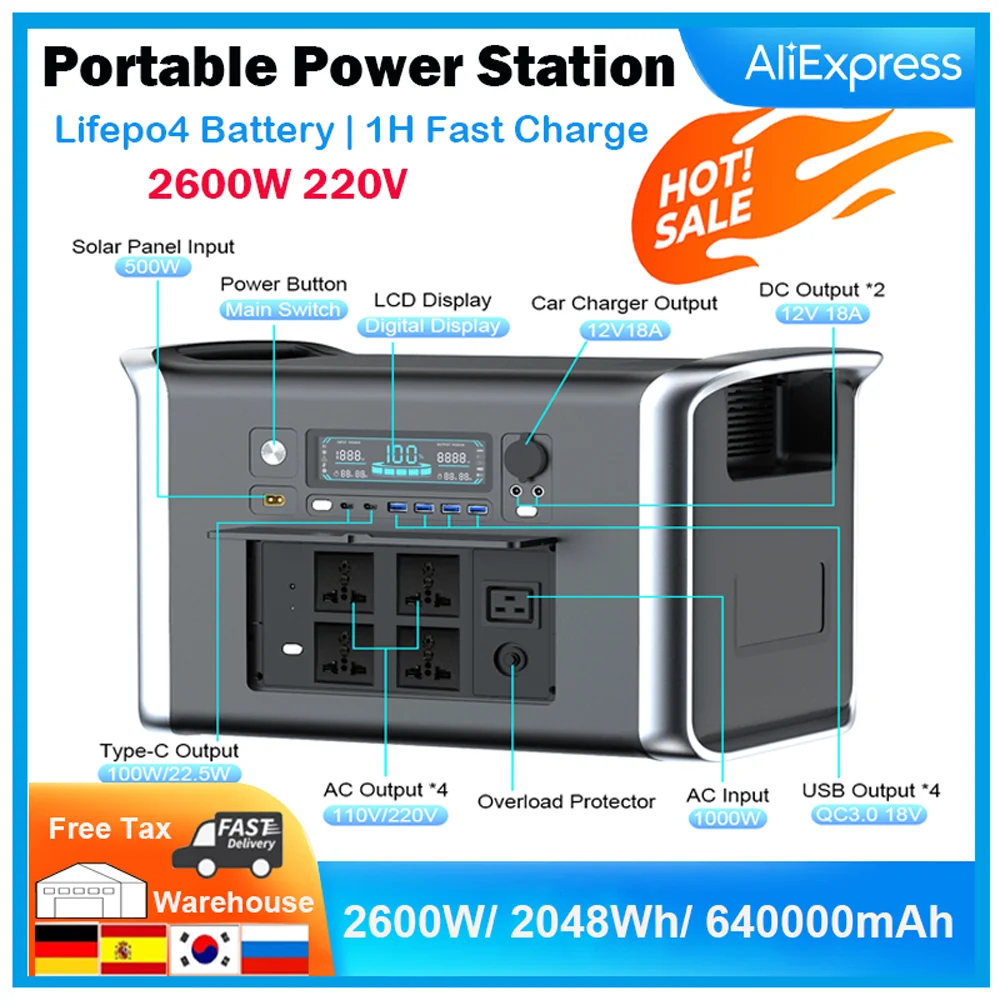 2600W(2048Wh) Camping Solar Generator, Portable Power Station, 220V Electric Machine,Lifepo4 Battery, Pure Sine Wave, For Home