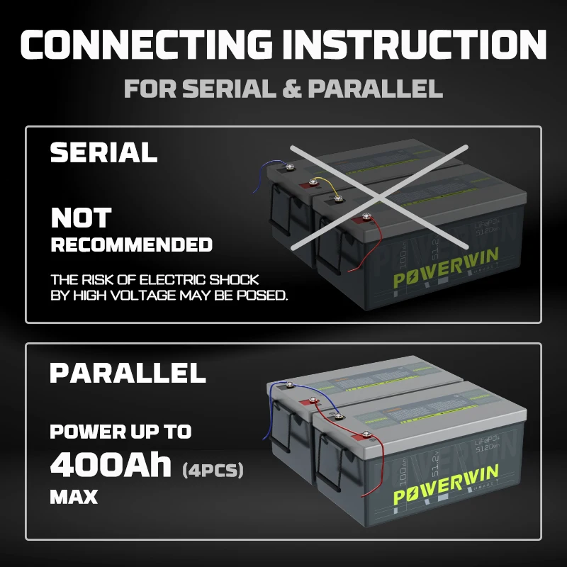 You can connect parallel to expand your battery capacity. Due to the high voltage may cause electric shock, serial connect in the battery is not recommended.