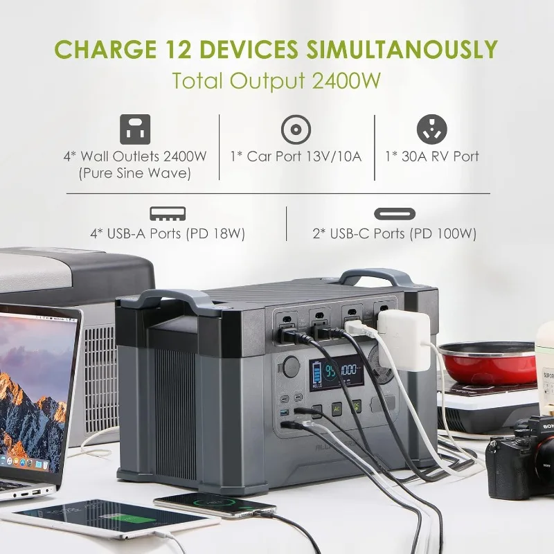 【1500Wh 2400W for All Home Appliances】: With a higher 2400W(surge 4000w) wattage and 1500Wh capacity, S2000 Pro features 4* standard pure sine wave AC outlet, 1* 13V10A Car port, 2* USB-C (PD 100W) and 4* USB-A (QC3.0)port, which will power almost all of your huge power devices(Coffee Maker, Electric Drill, Microwave Oven, Electric Fry Pan, Hair Dryer, Electric Kettle, Refrigerator, Washer etc.) as home wall outlets.