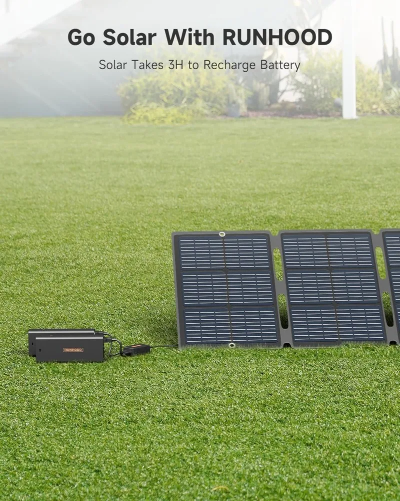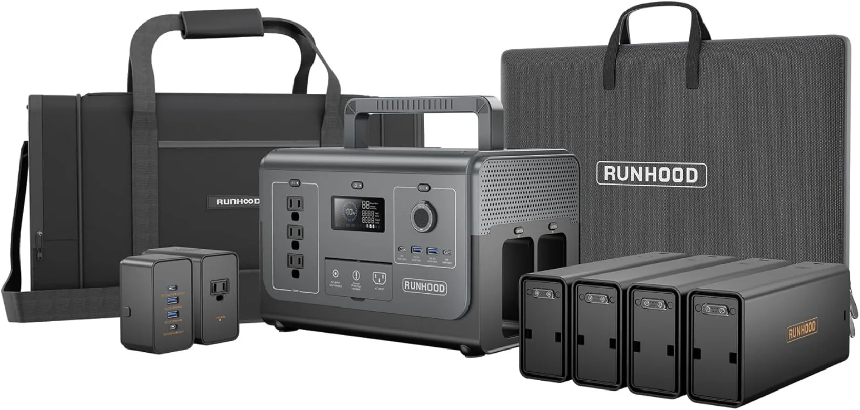 What you’ll get: 1* Runhood portable power station Rallye 1200 Pro (including HE1200, 4*324Wh EB324 batteries), 1*400W AC charger, 1*180W AC adapter, 1*120W car charger cable,1* 80W AC adapter, 1* USB adapter, 1*200W solar panel, 1* carrying case bag, 1* user manual, RUNHOODXGlobal Allianz Insurance.