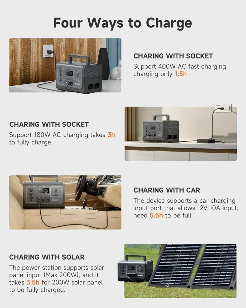 Experience unique charging methods. The Swappable Energy Bar (EB324) can be charged separately in 3 ways: AC, car, and solar panel (sold separately). The Rallye 1200 Pro can also be charged through these 3 methods.