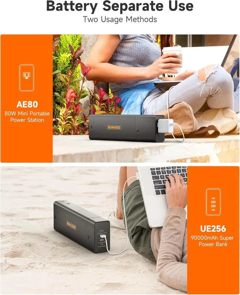 Enjoy versatile power options. The EB324 battery can be used in two ways. Connect it to the AC connector (AE80) to create a mini 80W/324Wh portable power station. Alternatively, use the DC connector (UE256) for a powerful 90000mAh super power with 2 PD 100W and 2 USB 3.0 outlets. Enjoy convenience and adaptability for all your power needs!